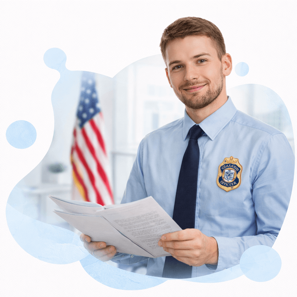 Professional immigration officer with fair skin reviewing documents with a friendly expression, American flag in blurred background