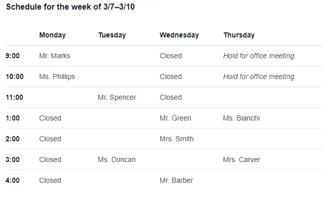 the 10:00 time, on Wednesday the office is closed, and on Thursday there is an office meeting scheduled during the
